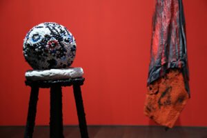 This striking installation from Januario Jano’s solo exhibition, Butaiuri in Tokyo 2024, masterfully juxtaposes texture, color, and form. The central sphere showcases intricate beadwork, drawing the viewer’s eye with a vivid mosaic of black, white, red, and blue. The hanging textile contrasts with its rugged, fragmented appearance, blending glossy black, fiery orange, and coarse materials. Set against a bold red backdrop, the dramatic and minimalistic setting intensifies the artwork’s emotional resonance. Jano skillfully explores themes of imperfection, cultural identity, and materiality, creating a visually captivating and thought-provoking piece.