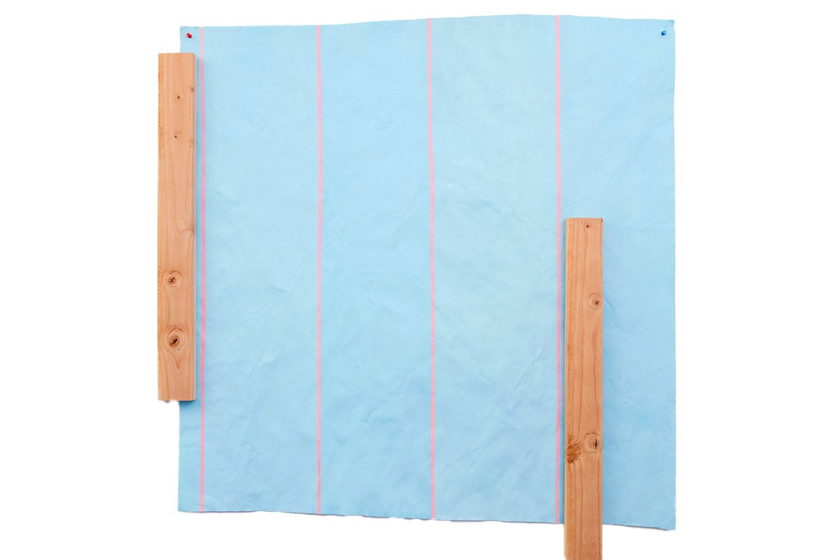 Photo: Stacy Fisher’s artwork blends raw textures and vibrant hues, featuring a pastel blue sheet framed by natural wooden planks and accented with delicate pink lines, evoking balance and simplicity.